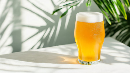 Refreshing Craft Beer Glass in Sunlit Tropical Setting.