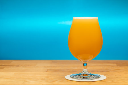 Full snifter glass of hazy New England IPA (NEIPA) pale ale beer on wooden table with blue background
