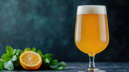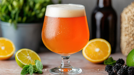 A refreshing glass of amber beer garnished with mint, surrounded by citrus fruits and a bottle, evoking a vibrant, casual atmosphere.
