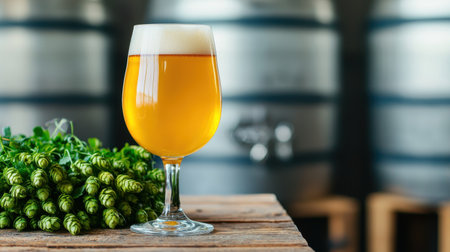 A refreshing glass of golden beer sits on a wooden surface, accompanied by fresh hops, with barrels in the background, creating a cozy brewery atmosphere.