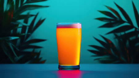 A vibrant orange drink is showcased in a clear glass, surrounded by tropical leaves against a gradient blue background.