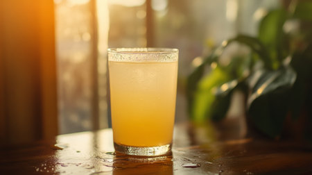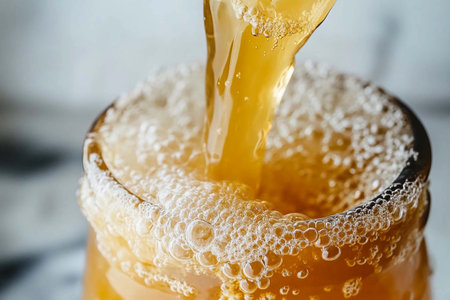 Bubbly golden beverage overflowing from a glass jar captures the essence of refreshing summer moments in a cozy setting. Generative AI