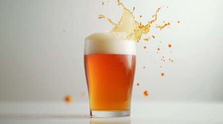 A pint of beer with a rich, creamy head and a splash of beer being poured into the glass, captured with a clean white backdrop for focus.