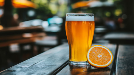 A refreshing glass of beer sits on a wooden table, accompanied by a vibrant orange slice. The drink exudes a cool, inviting appeal in a sunlit setting.