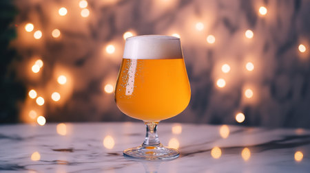A vibrant glass of refreshing beer sits on a marble table, with frothy foam and shimmering bubbles. The soft bokeh lights create a festive ambiance, perfect for gatherings.