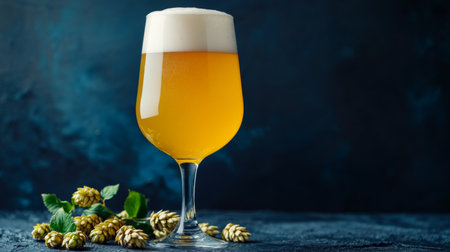 A beautifully styled glass of craft beer with frothy foam sits against a dark background. Fresh hops surround the glass, enhancing the drink's appeal.