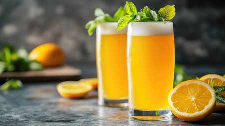 A refreshing golden beverage served in a tall glass, accompanied by a fresh orange half and mint leaves, set against a dark, textured background.