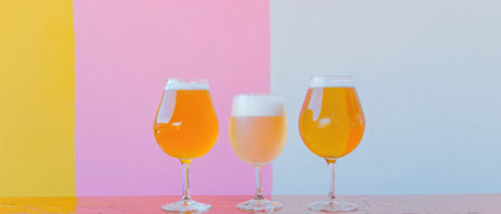 A vibrant glass of beer sits on a colorful background, showcasing its golden hue and foamy top, perfect for a refreshing drink.