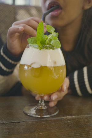 a child takes a sip of a vibrant drink topped with mint leaves.