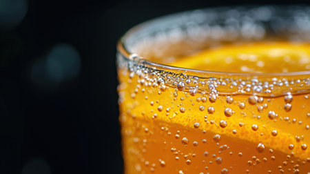 Glorious bubbles rise to the surface of refreshingly vibrant orange juice, catching light in a playful dance against a rich, dark background, inviting taste and thirst in every droplet.