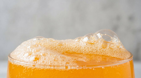 Effervescent orange soda with frothy bubbles rising above a glass rim against a light neutral background in a refreshing closeup.