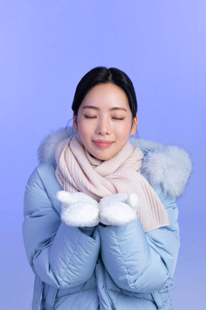 beautiful young Korean Asian woman portrait studio photo in winter skin beauty and cosmetics concept__hand motion