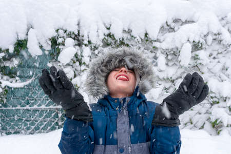 Child standing with tongue out in the snow. Child wears a winter coat with hood over his head and black gloves