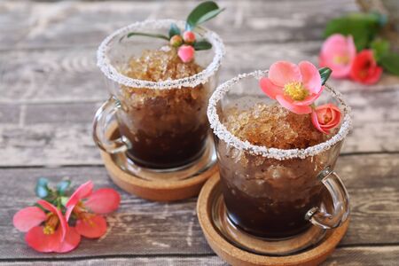 Coffee granita, frozen summer dessert in two cups, selective focus
