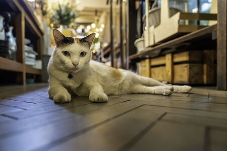 Black and white cat chubby in Taipei. Cat in the ancient village. Cute cat at Houtong Cat Village, Taiwan.