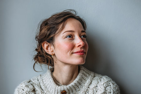 A young woman with soft features and brown hair sits comfortably against a pale gray wall. She wears a knitted sweater and appears calm, reflecting warmth and serenity in her expression.