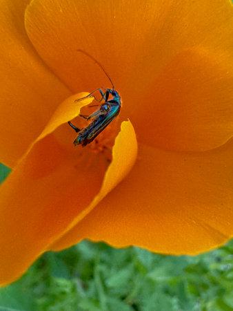 Green forester moth rests inside vibrant orange California popp, capturing rare insect moment, biodiversity beauty, and pollinator attraction in summer garden habitat
