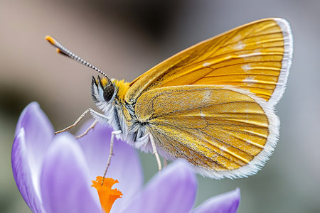 Close-up of a small orange butterfly with white-edged wings perched on a purple crocus flower, feeding on nectar in spring