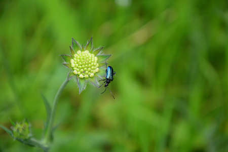 Extreme close up of a beautiful purple flower with a bug on it. Creative. Blossoming flower bud and an insect on blurred green background.