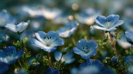A panoramic wide view of Nemophila field growing closely together in a dewy morning shining droplets on leaves warm soft daylight ultra realistic photography cinematic wide composition lifelike natural scene