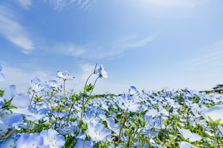 Blue sky and Nemophila menziesii (baby blue eyes flower), flower field at Hitachi Seaside park, Spring, Ibaraki, Japan