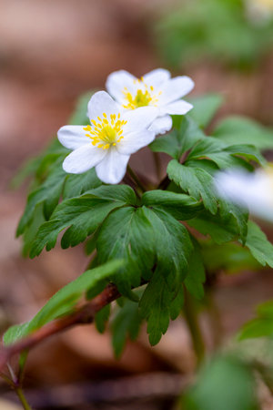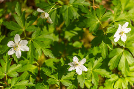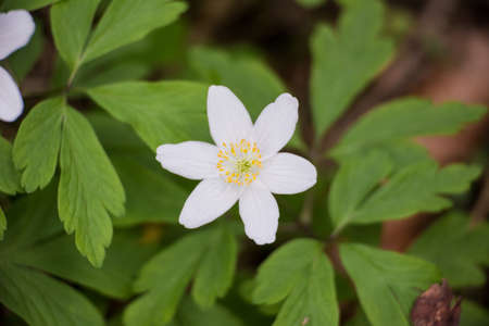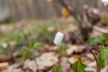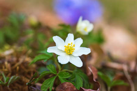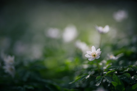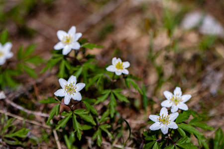 A beautiful white wood anemone flowers blooming on the forest ground in natural habitat. Spring scenery of Northern Europe.