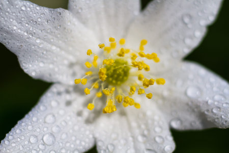 Macro close up of a wild white alpine anemone (Pulsatilla alpina) covered with shiny raindrops and details of petals and pistils