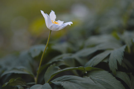 Wood anemone Anemona nemorosa single flower in spring forest closeup