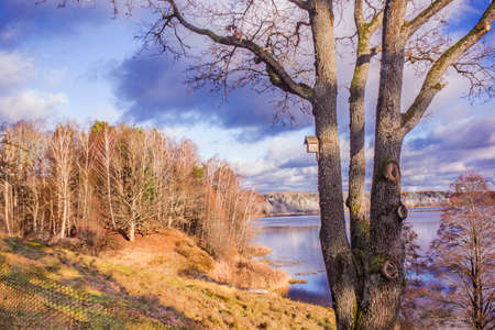 Autumn landscape with a tree trunk and a birdhouse at the lake