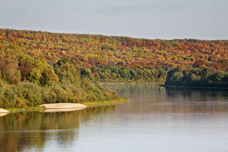 Orange autumn landscape overlooking a calm river with a reflection of blue sky surrounded by forest. Trees have yellow and green leaves.