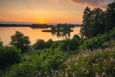 Summer landscape with lake in the field with blue sky. Sunset orange sun on the horizon.