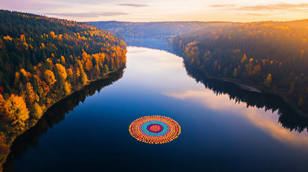 A colorful, circular art installation made of small, rounded objects floats on a dark, calm body of water, surrounded by autumn foliage.