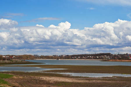Spring landscape with blue sky, river and meadow. Classic plain spring Russian landscape with a small river. Blue sky, small clouds, sunny spring day