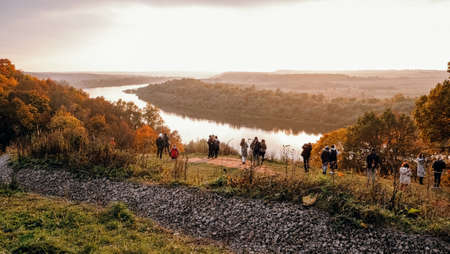 People stand on the observation deck on the mountain in autumn and watch the sunset, looking at the river and forest. Autumn beautiful landscape.