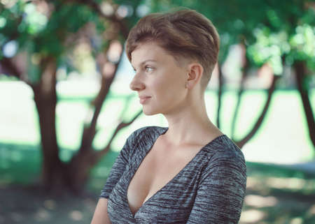 Portrait of smiling young middle aged white caucasian girl woman with short hair stylish haircut in t-shirt looking away outside in summer park
