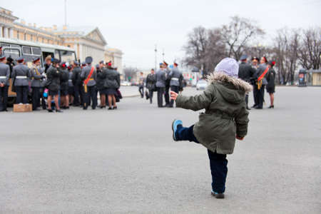 Saint-Petersburg, Russia - May 5: small child imitates soldiers on parade rehearsal before celebration of 66th Anniversary of Victory Day on Palace Square