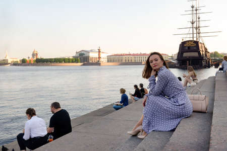people sitting on the Neva river embankment at sunset, 1 white woman in a dress on the embankment in the city