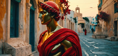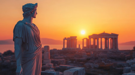 Ancient Greek sculpture with city ruins on background at golden hour sunset.