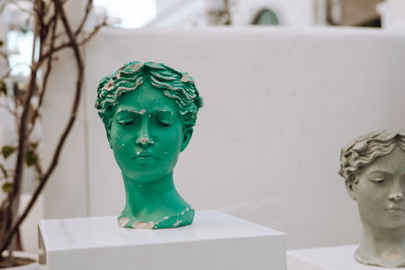 An outdoor arrangement showcases artistic busts in varying shades of green and white on white pedestals. Surrounding greenery enhances the tranquil atmosphere of this modern display.