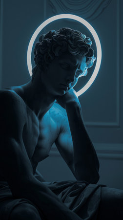 Dramatic Sculpture of Thoughtful Man with Neon Halo in Moody Lighting
