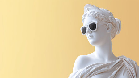 Cool ancient Greek or Roman white statue of woman wearing sunglasses on pastel background with a free place for text. Contemporary art and fashion