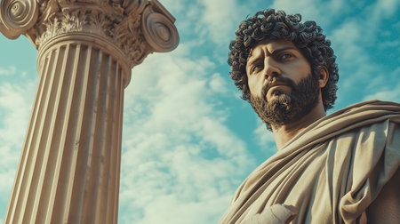 A detailed statue of a bearded figure beside a classical column under a blue sky during the day depicts ancient history and artistry