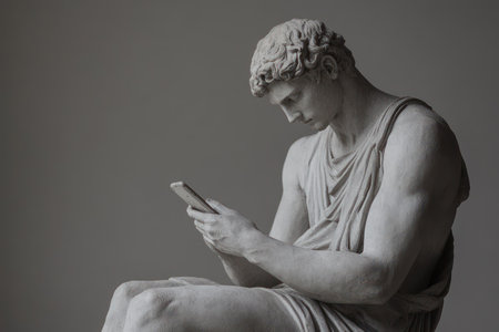 Classical marble sculpture of a thoughtful man casually holding a smartphone, blending ancient art with modern digital culture.