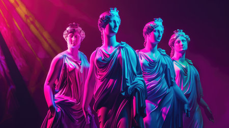 A stunning classical statue bathed in colorful lighting, showcasing intricate details and artistic mastery in ancient architecture. A blend of history and modern aesthetics.