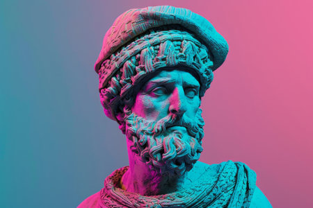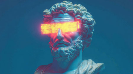 Neon-enhanced bust of ancient bearded male with futuristic glasses.