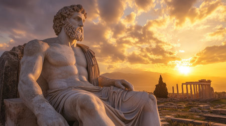 Sculpture of Greek philosopher Socrates in ancient Greece with city ruins on background at golden hour sunset.