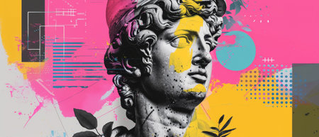 Collage with plaster antique sculpture of human face in a pop art style. Creative concept colorful neon image with ancient statue head. Cyberpunk, webpunk and surreal style poster.