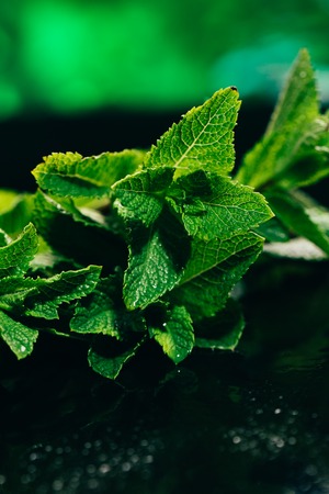Fresh Green Peppermint leaves on the Dark background.