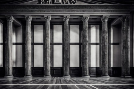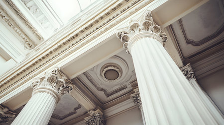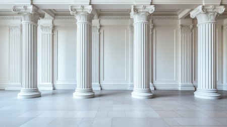 Majestic classical columns in a historic building. Symmetric architectural perspective with soft light. ideal for cultural and architectural themes