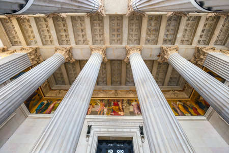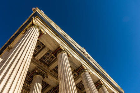 Classical marble pillars detail on the facade of National Academy of Athens, Greece